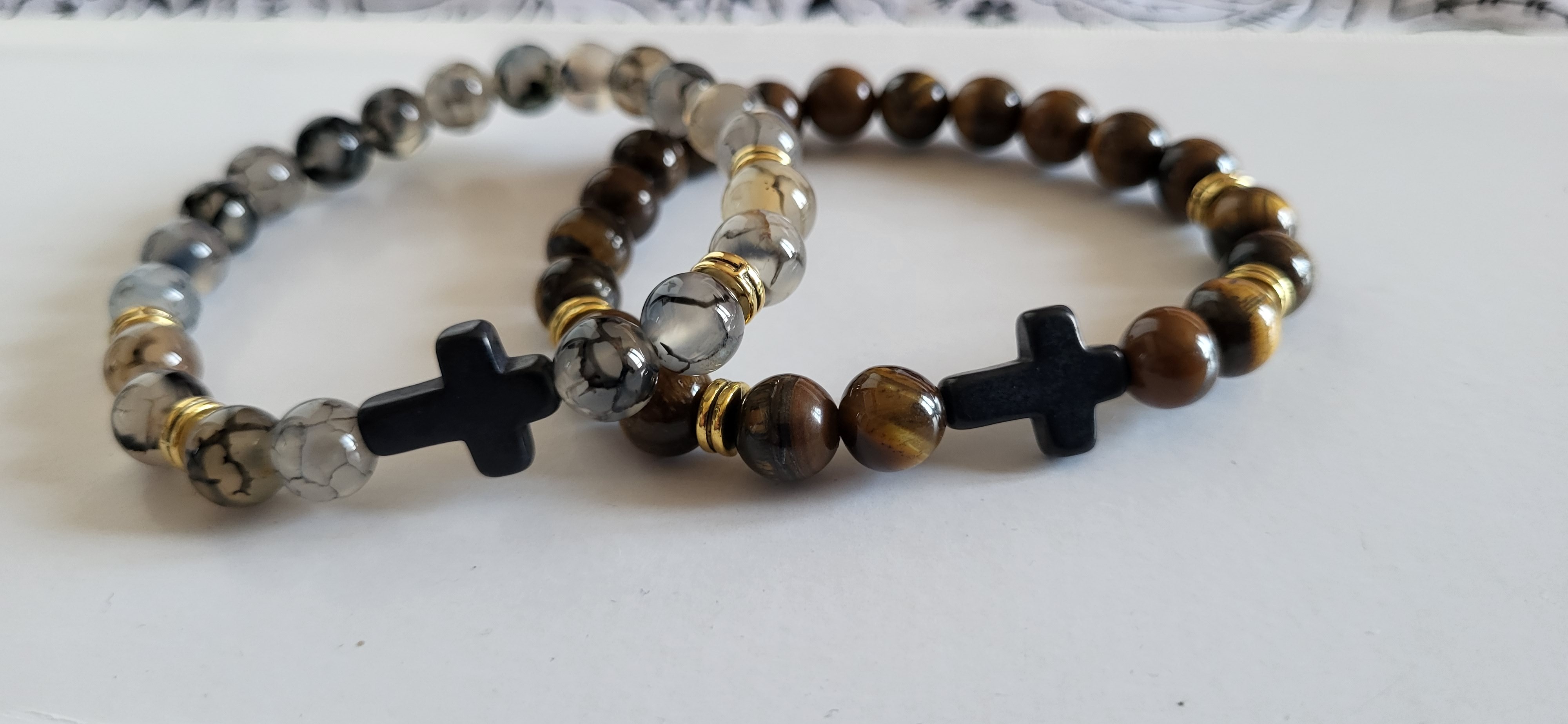 Bracelets pierres naturelles avec croix, motif dragon et œil du tigre